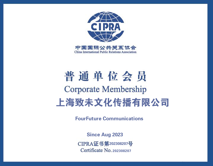 致未传播于2023年8月通过中国国际公共关系协会(CIPRA)审核,正式成为其单位会员,获颁单位会员证书。 中国国际公共关系协会是具有社团法人地位的全国性公共关系涉外专业组织,业务主管单位为...
